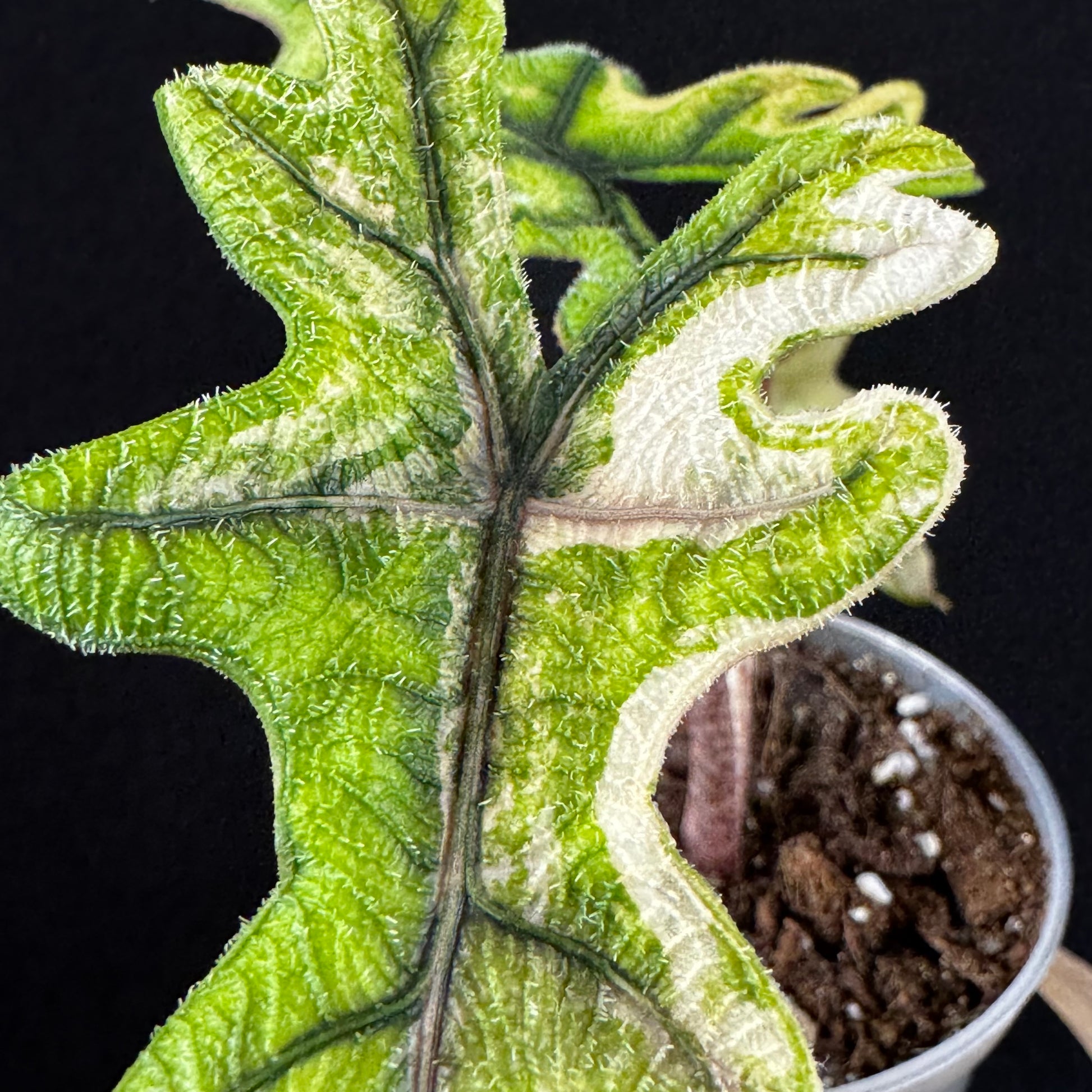 Die Tandurusa, besser bekannt als Alocasia Jacklyn, ist schon in ihrer Naturform spektakulär – mit ihren tief eingeschnittenen, fingerartigen Blättern und der markanten Nervatur. In der Variegata-Version wird sie zu einer absoluten Rarität: weiße bis cremefarbene Zeichnungen legen sich wie zufällige Pinselstriche über das kräftige Grün. Jede Pflanze ist ein Unikat – mal mit dezenten Sprenkeln, mal mit auffälligen Mustern. Sie bringt pure Dschungel-Atmosphäre und gleichzeitig ein modernes Design-Statement in dein Zuhause.